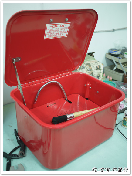 這台紅色的玩意兒是黑貂過年前新添購的零件清洗機,一般來說是車店才會買的玩意兒,